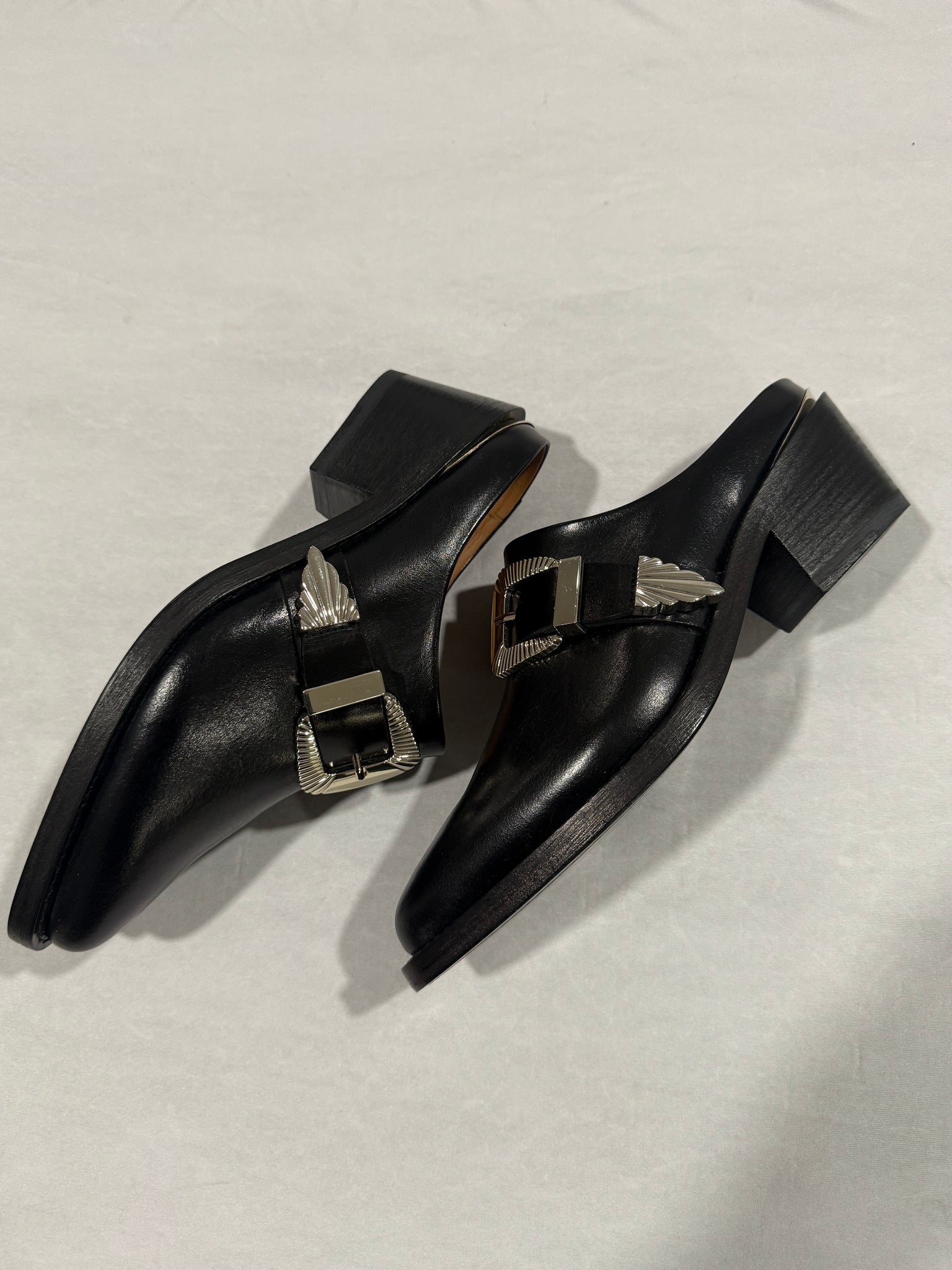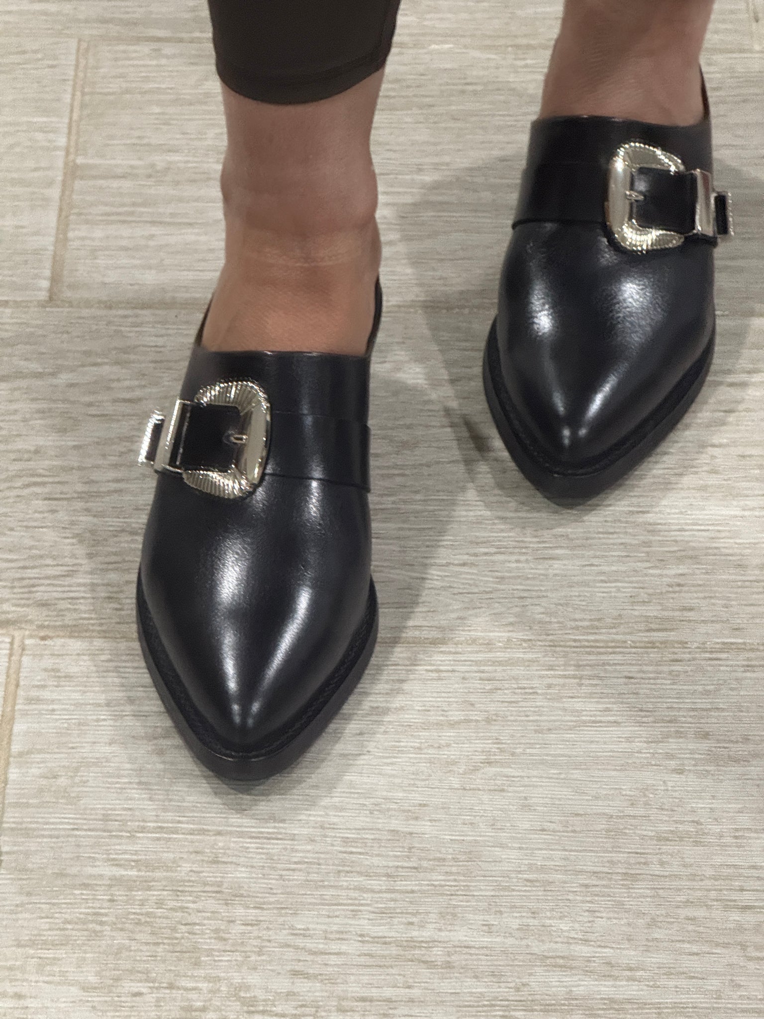 • Load image into Gallery viewer, Partlow Black Silver Hardware Slip On Mules