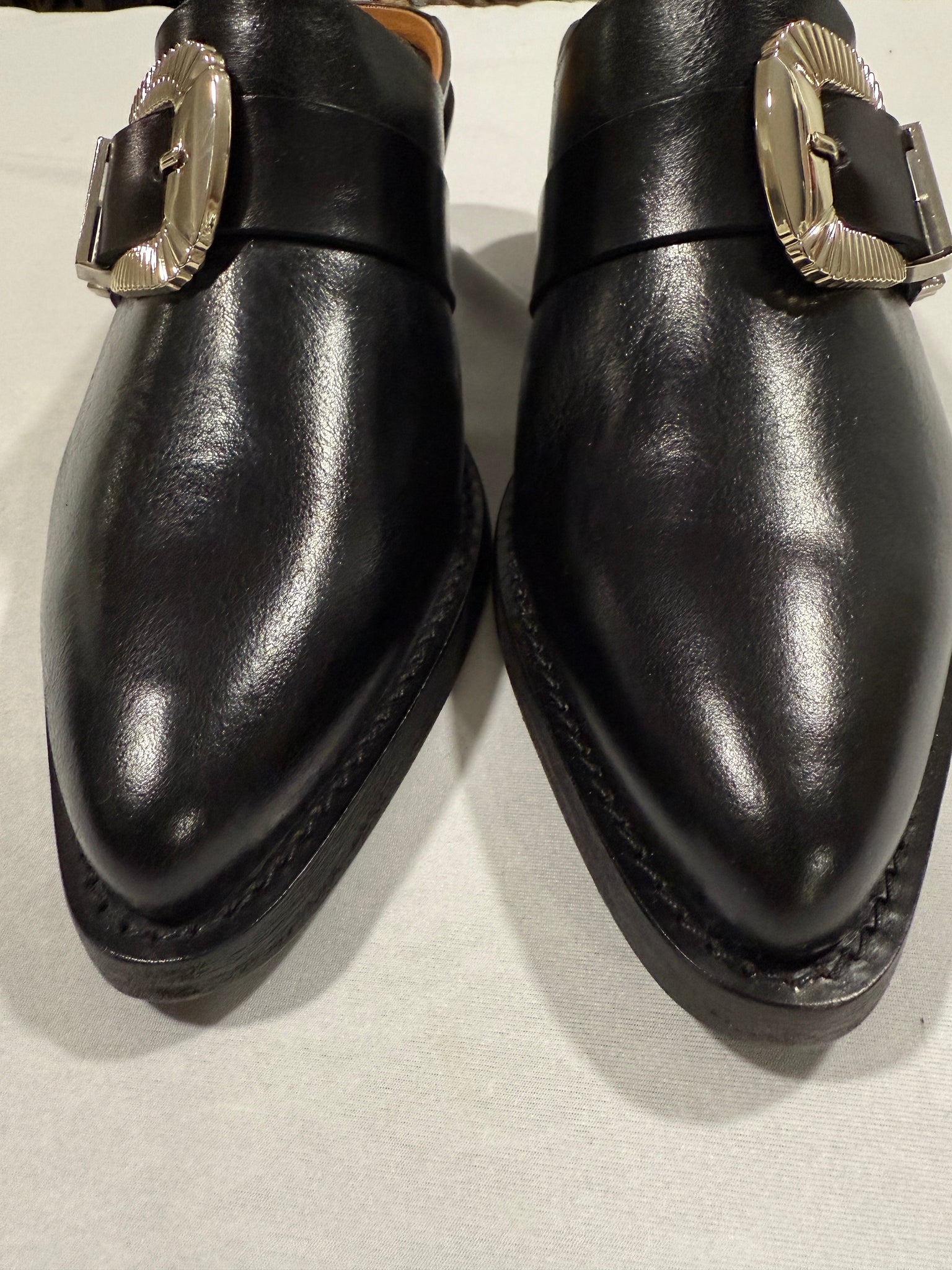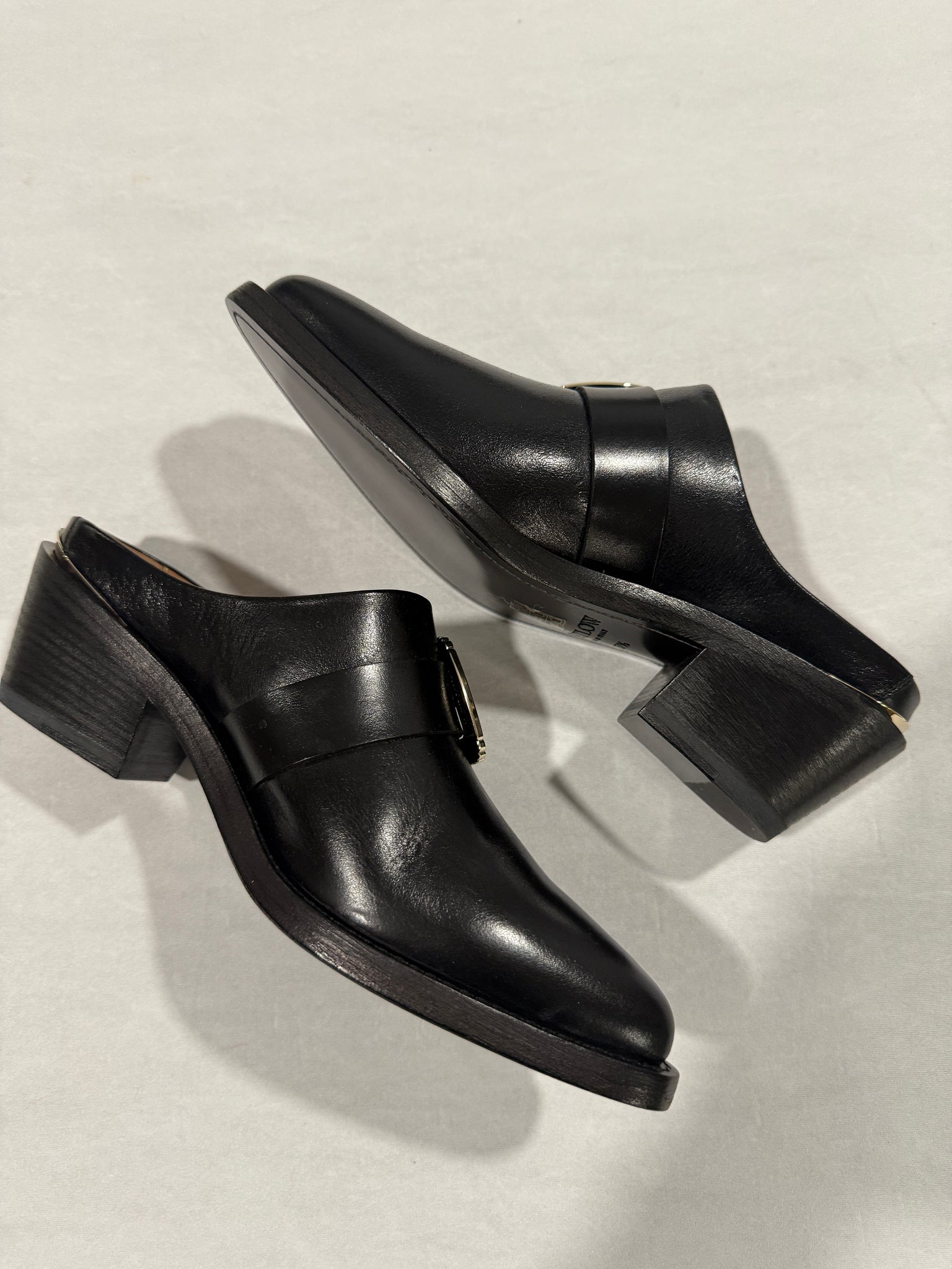 Slip on mule. Calfskin upper with buckle detail. 55mm/2.14" heel height. 6mm padded insole. Leather lining. Leather outsole with stitched welt. Signature Partlow plaque. Handcrafted in Italy.