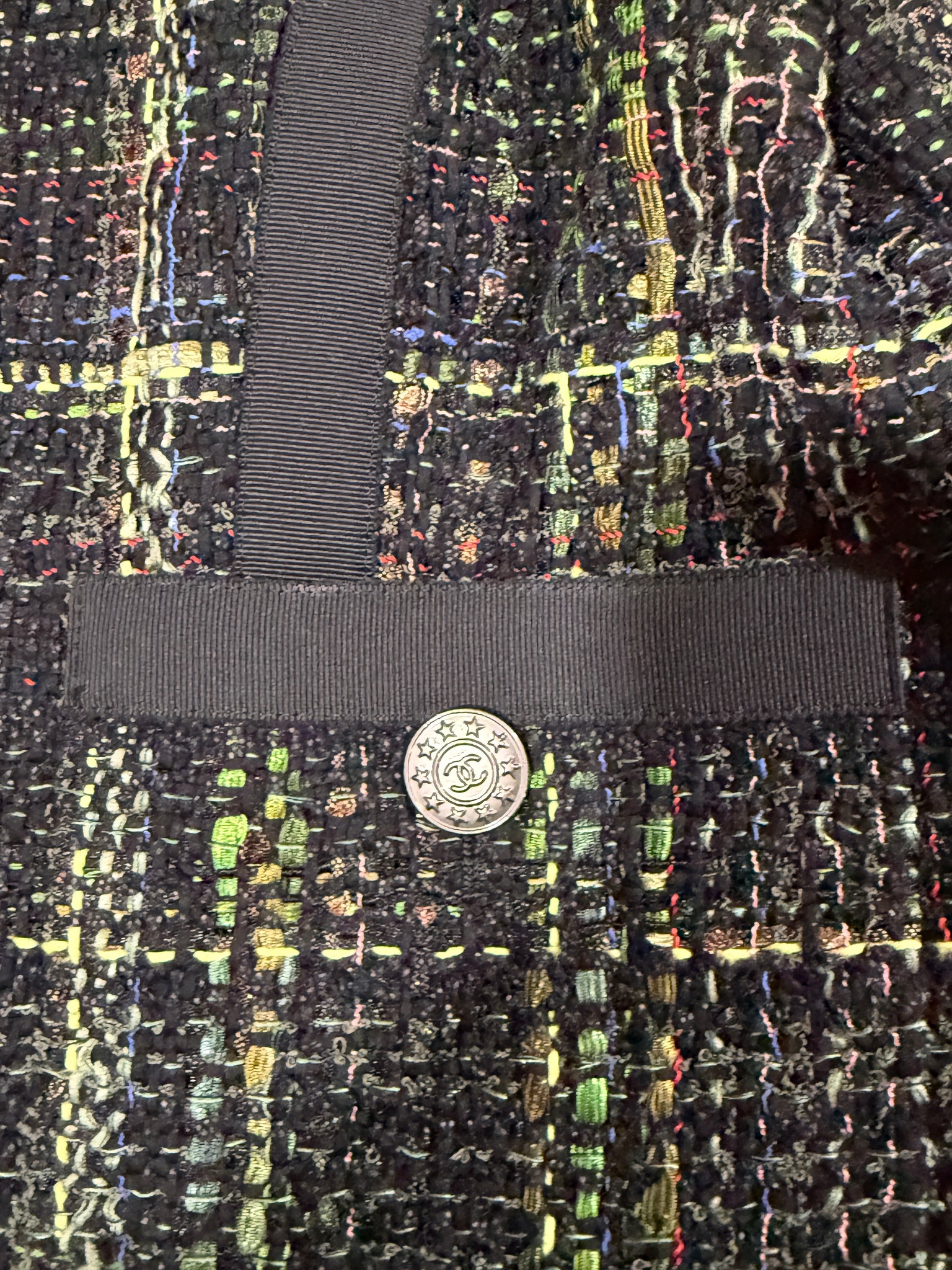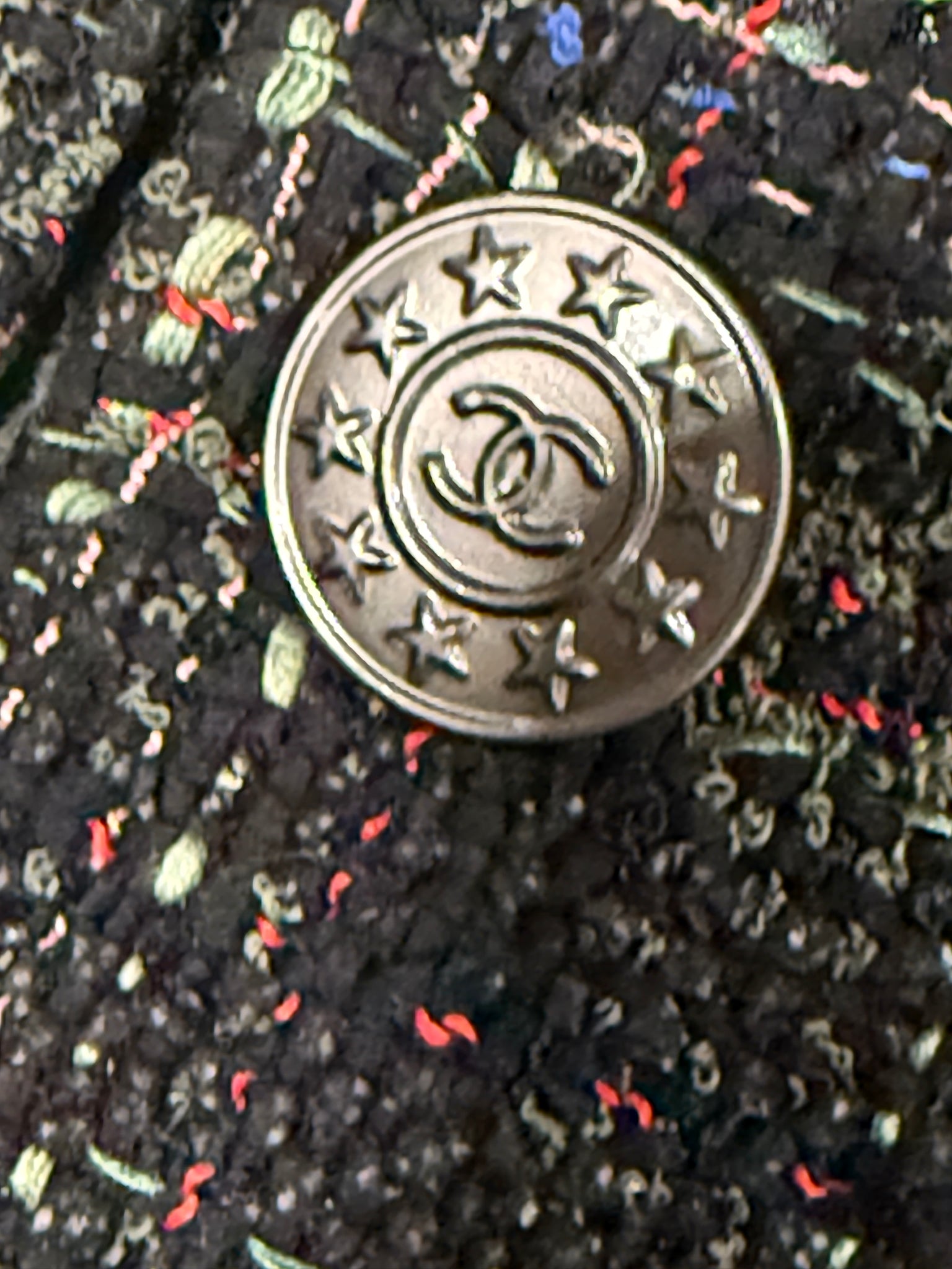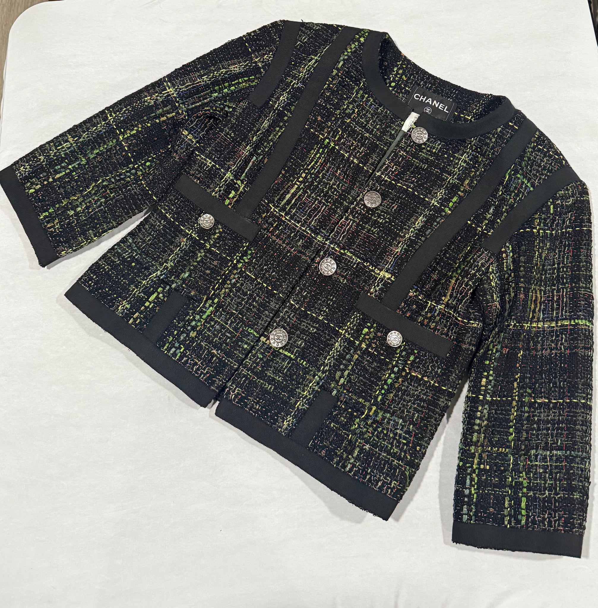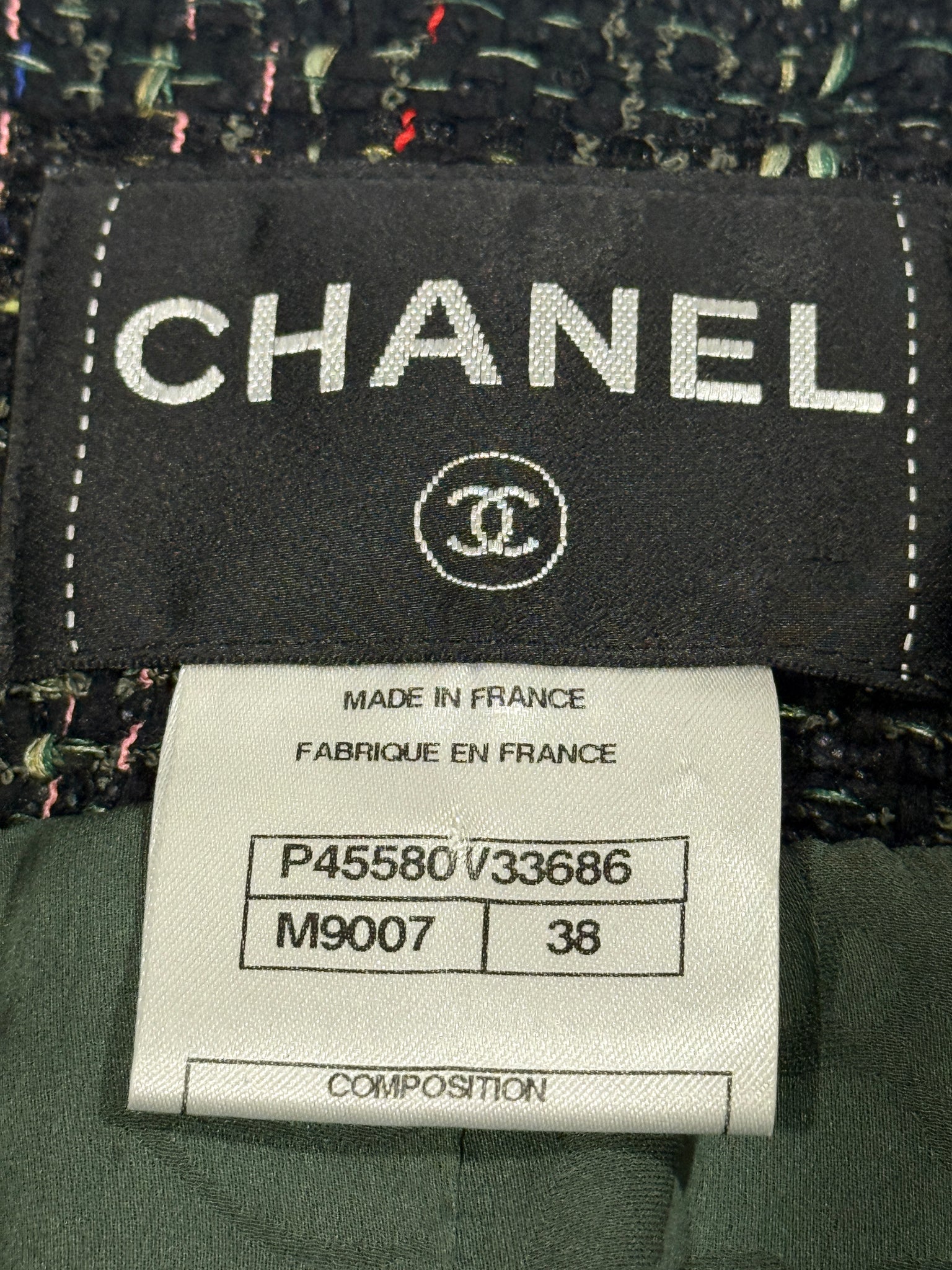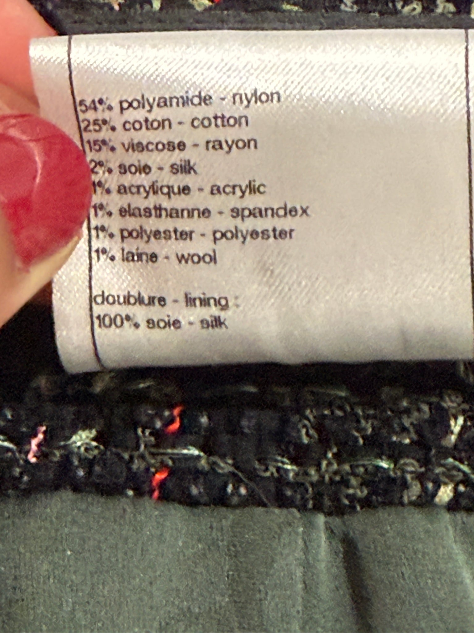 Chanel tweed blazer. Fabric 54% nylon, 1% acrylic, 15% rayon, 25% cotton. 100% silk lining with chain at bottom.