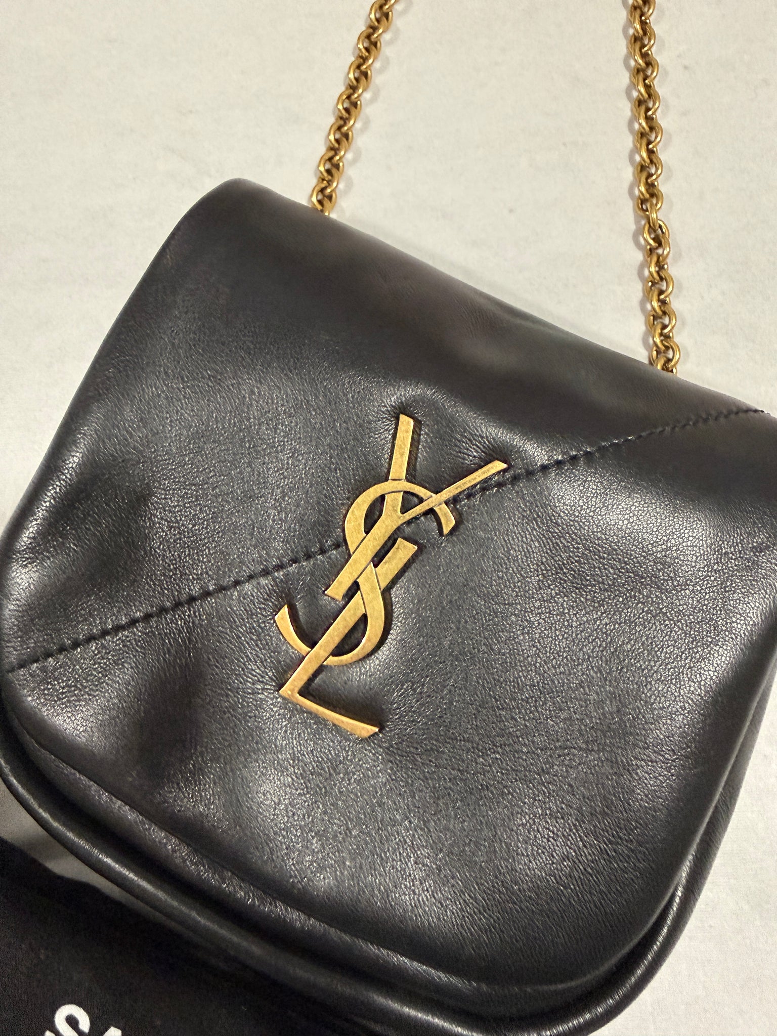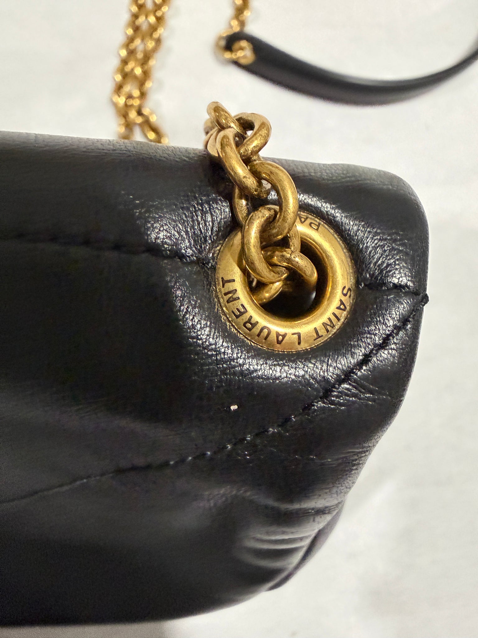 The bag features an aged gold chain link crossbody shoulder strap with shoulder pads and a facing flap with an aged gold YSL logo.